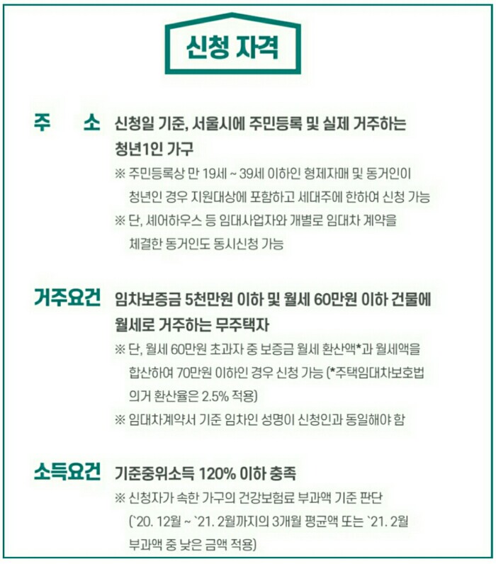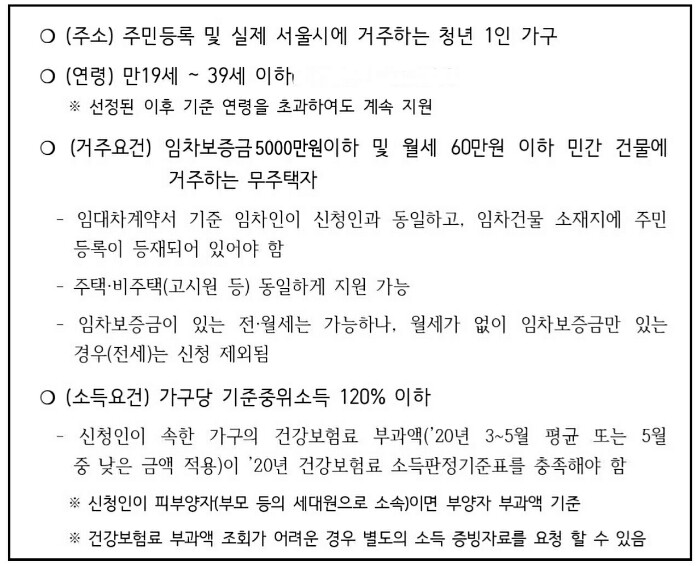 2. 주소지 : 주민등록 및 서울시에 거주하는 청년 1인 가구