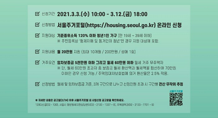 온라인상담 서울주거포털 청년월세지원, 청년월세지원상담센터(02-2133-1337~1339), 다산콜센터(120), 주택정책과(02-2133-7702~7706)에서 문의 받을 수 있습니다.