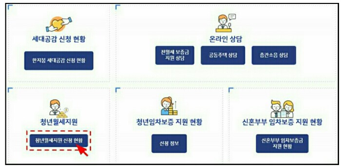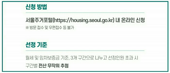 1. 신청방법 : 서울주거포털 (http://housing.seoul.go.kr) 청년월세지원 란에 온라인 신청 및 접수하면 됩니다. 직접방문 및 우편 접수 등은 불가능합니다.