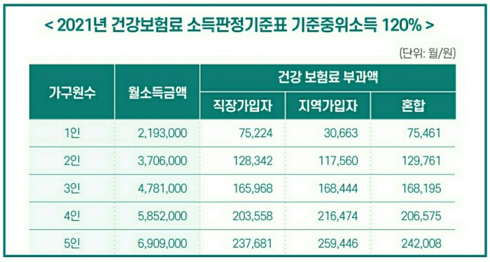< 2021년 기준중위소득 120% 이하 건강보험료 기준 >