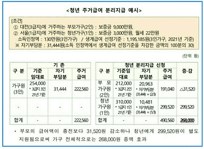 A 지역에 거주하는 기초생활 주거급여를 받고 있는 부모 2명과 대학을 다니기 위해 홀로 서울로 이사를 하여 거주하는 청년 1명으로 구성된 부모 2명 + 청년 1명 = 3인가구의 경우는 주거급여 월 21만7000원을 받았습니다. ➡ 그러나 2021년 1월부터는 부모 2인 가구는 월 18만3000원 받고, 청년 1인은 월 31만원을 각각 분리해 지급받을 수 있습니다.