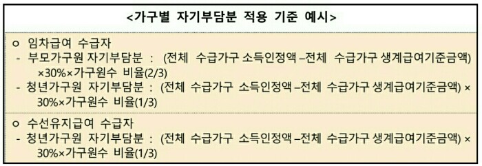 ➋ 자기부담분 : (전체가구 소득인정액 - 전체가구 생계급여기준금액) × 부모 가구원수 비율 × 30%
