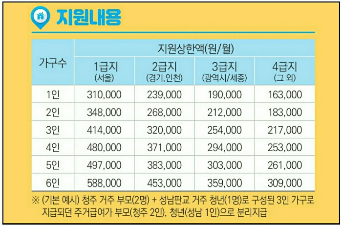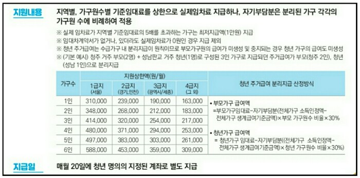 지역별, 가구원수별 기준임대료를 상한으로 실제임차료가 지급되는데 가구원 수와 지역별로 지원상한액이 정해져 있습니다. 지원금은 부모가구와 별도로 지급되며 매월 20일에 청년 명의의 계좌에 입금됩니다.