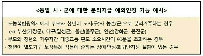 ➎ 부모와 청년의 주민등록상 거주지가 동일하더라도 예외로 다음과 같은 경우에는 청년 주거급여 분리지급을 받을 수 있습니다.