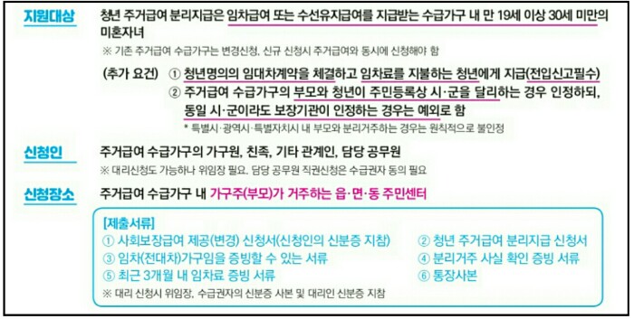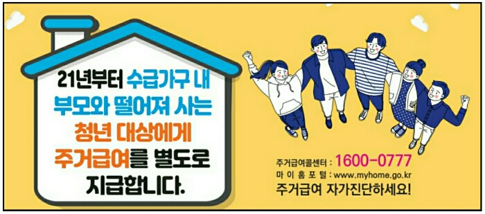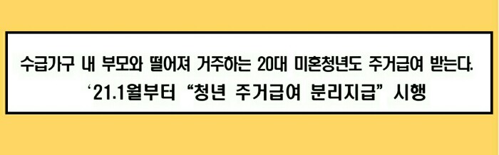 기초생활 주거급여를 받고 있는 가구에서 부모와 떨어져 거주하는 20대 미혼 청년의 경우, 국민기초생활법상 동일가구로 인정되어 주거급여를 받을 수 없었으나 2021년 1월부터는 부모에게 지급되는 주거급여와는 별도로 청년에게 지급되는 지원금입니다.