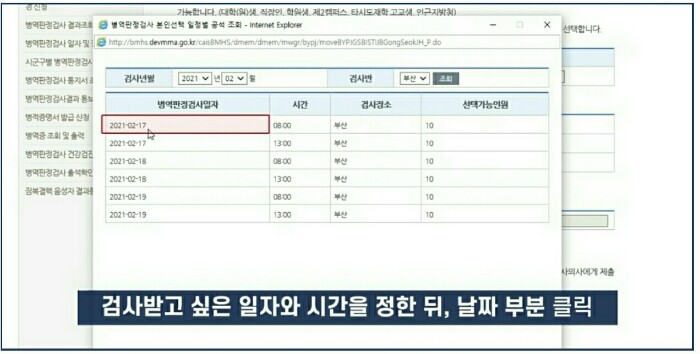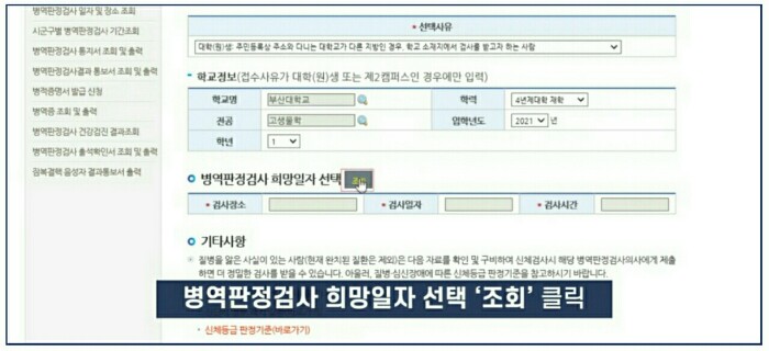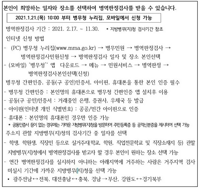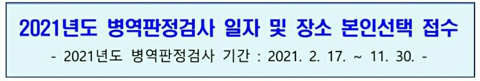 2021년도 병역판정검사 일자 및 장소 본인선택은 2021년 2월 21일 오전 10시부터 접수받습니다.