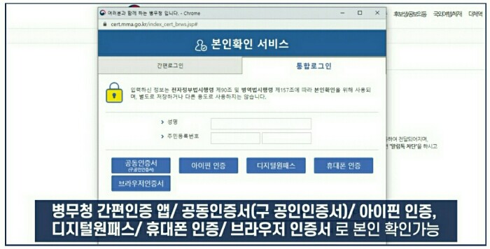 - 병무청 간편인증 : 본인명의 휴대폰으로 병무청 간편인증 앱 설치후 이용