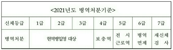 2021년도 병역판정검사 병역처분기준은 학력사유에 의한 병역처분 기준이 폐지됩니다. 신체등급 1~3급인 사람은 학력에 관계 없이 현역병 입영대상으로 병역처분이 됩니다.