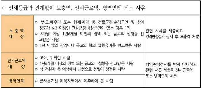 ▶ 신체등급과 관계없이 보충역, 전시근로역, 병역면제 되는 사유