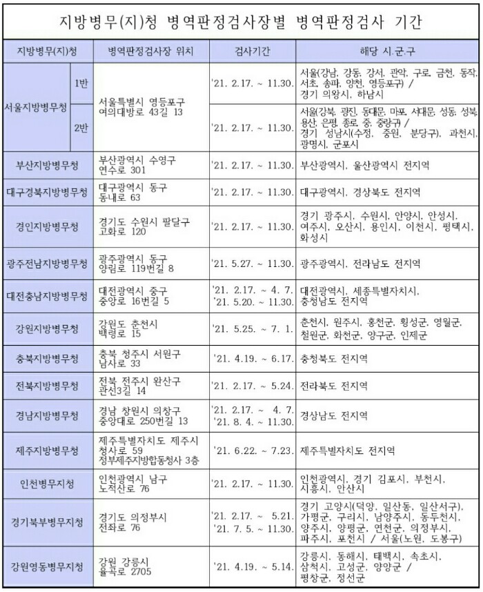 ▶ 2021년도 병무청 병역판정검사 일정표 및 위치 검사기간