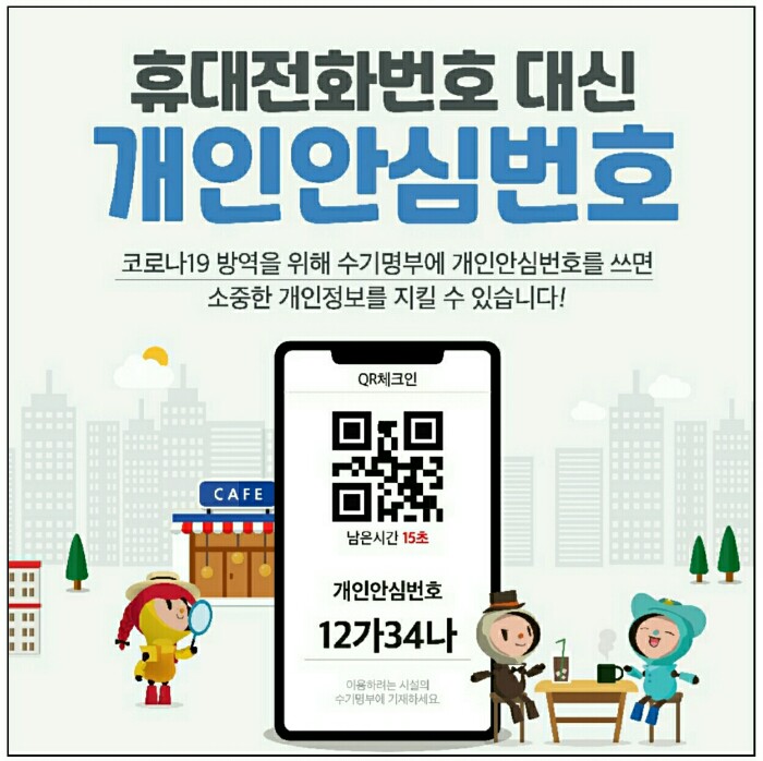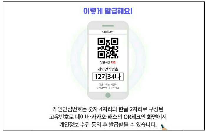 고유번호인 개인안심번호를 암기하거나 기록하여 소지하고 다니는 경우 등에는 QR체크인 화면을 확인할 필요가 없습니다.