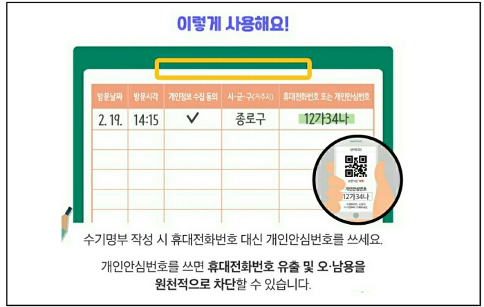 다만, 전자출입명부가 비치되어 있지 않은 경우 등 불가피하게 수기명부를 작성해야 하는 때에는 개인안심번호를 사용하시면 됩니다.