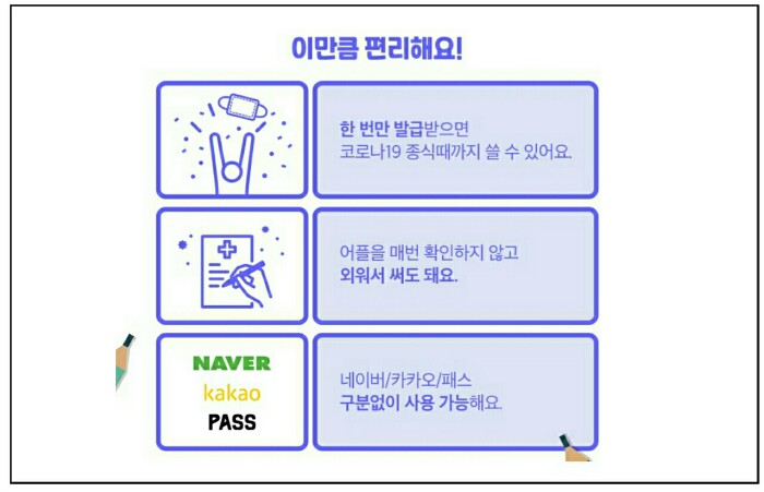 QR코드 발급기관인 네이버, 카카오, PASS의 전자출입명부 QR체크인 화면에서 손쉽게 확인할 수 있으며 최초 1회 발급 후 코로나19 종식 시까지 사용할 수 있습니다.