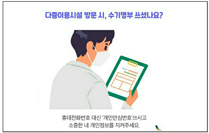 노래연습장, PC방, 클럽, 주점 등 고위험시설들은 의무적으로 전자출입명부를 이용하면 되고, 전자출입명부가 비치되어 있지 않은 다중이용시설 등 수기명부를 작성해야 할 때는 휴대전화번호 대신 개인안심번호를 작성하면 됩니다.