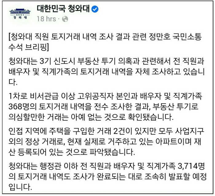 청와대는 3기 신도시 부동산 투기 의혹과 관련해서 전체 직원과 배우자 및 직계가족의 토지거래 내역을 자체 조사하고 있습니다. 1차로 비서관급 이상 고위공직자 본인과 배우자 및 직계가족 368명의 토지거래 내역을 전수 조사한 결과, 부동산 투기로 의심할만한 거래는 아예 없는 것으로 확인됐습니다.