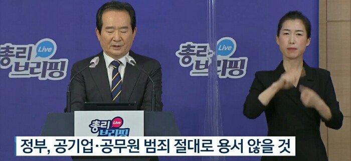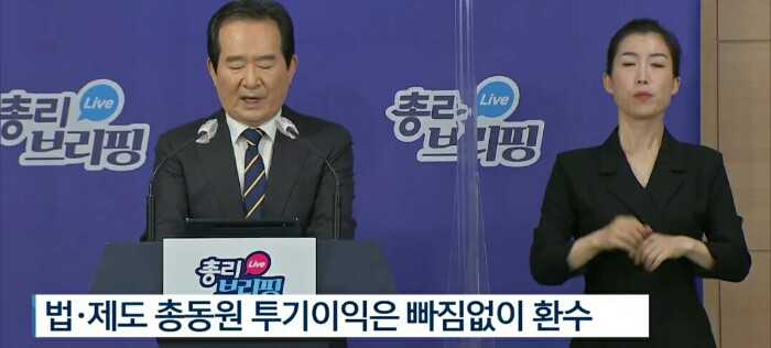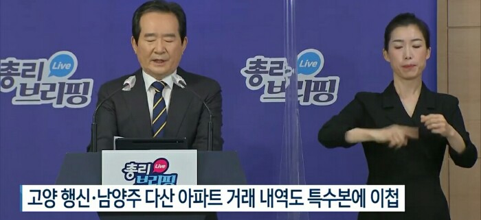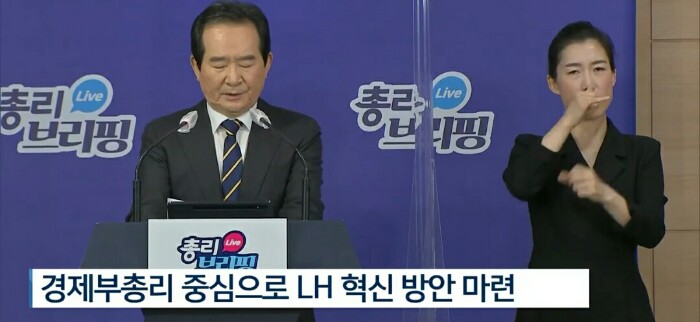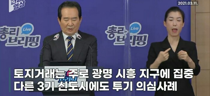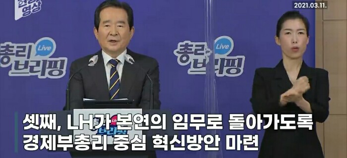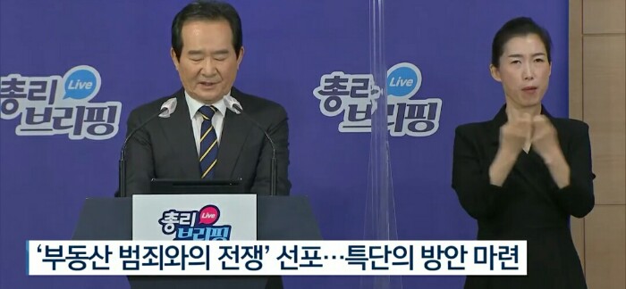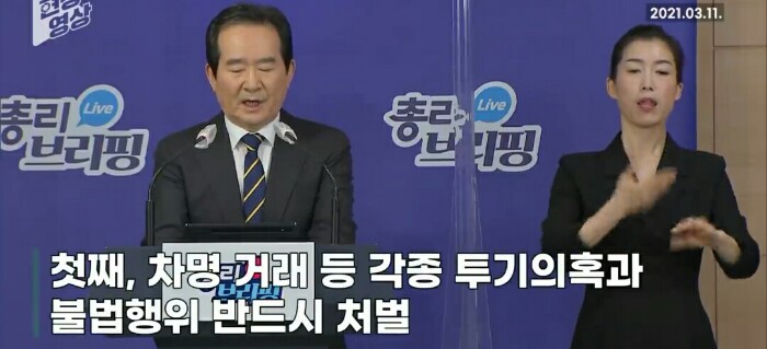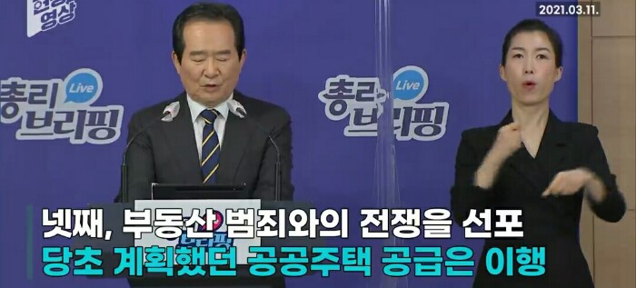 정부는 부동산 범죄와의 전쟁을 선포합니다. 허위매물, 기획부동산, 떳다방 등 부동산 시장에서 자행되고 있는 불법과 불공정 행위를 엄단할 특단의 방안을 마련하여 강력하게 집행하겠습니다. 아울러 주택시장 안정을 위해, 당초 계획했던 공공주택 공급은 차질없이 이행하겠습니다. 국민의 신뢰 없는 정책은 성공하기 어렵습니다. 이번 LH사건을 철저하게 다스려 다시 시작하는 계기로 삼겠습니다. 떨어진 국민의 신뢰를 회복하기 위하여 내각 전체가 긴장된 자세로 업무에 매진하겠습니다.