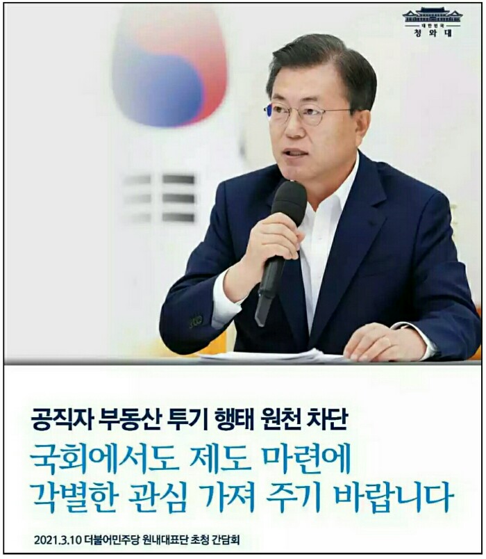 이어 문재인 대통령은 "개발을 담당하는 공공기관 직원이나 공직자가 관련 정보를 부당하게 이용해 부동산 투기를 한다는 것은 우리 사회의 공정과 신뢰를 바닥에서 무너뜨리는 용납할 수 없는 비리 행위이고 지금 LH 직원들의 토지 투기 문제로 국민들의 분노가 매우 크다며 공직자들의 부동산 투기 등 부패 근절을 위한 제도 개선을 주문했습니다.