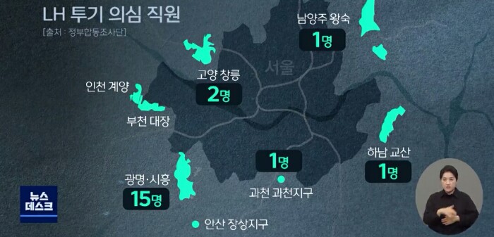 1차 조사 결과 LH 투기 의혹 직원은 지역별로 보면 광명시흥이 15명으로 가장 많았으며, 고양 창릉 2명, 남양주 왕숙 1명, 과천 과천 1명, 하남 교산 1명입니다. LH 직원이 소유주로 추정되는 토지거래는 총 10건으로 교산동 3건, 천현동 4건, 춘궁동 2건, 하사창동 1건입니다. LH 직원 중 10건의 토지 소유주와 동일 이름을 가진 사람은 19명입니다.