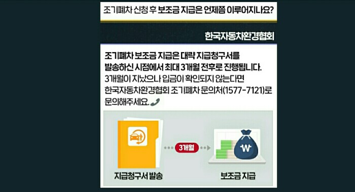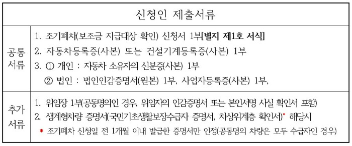 차량소유자는 '조기폐차 대상차량 확인서'를 발급받은 후 2개월 이내에 조기폐차 보조금 지급청구서를 서울시에 제출합니다.