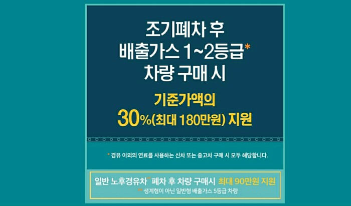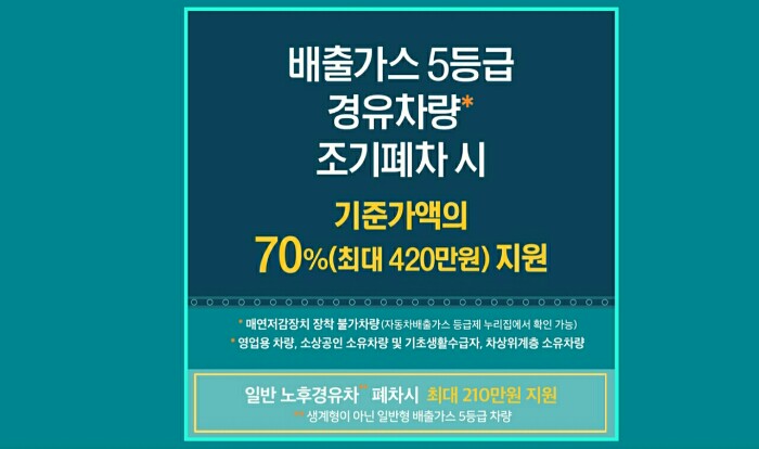 영업용차량, 저소득층, 소상공인 소유 경유차량을 조기폐차하는 경우 차량기준가액의 70% 최대 420만원을 기본보조금으로 지급하고, 경유차를 제외한 신차 또는 배출가스 1~2급 중고차를 구매하면 나머지 30% 최대 180만원를 추가로 지원합니다.