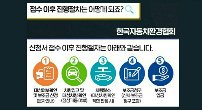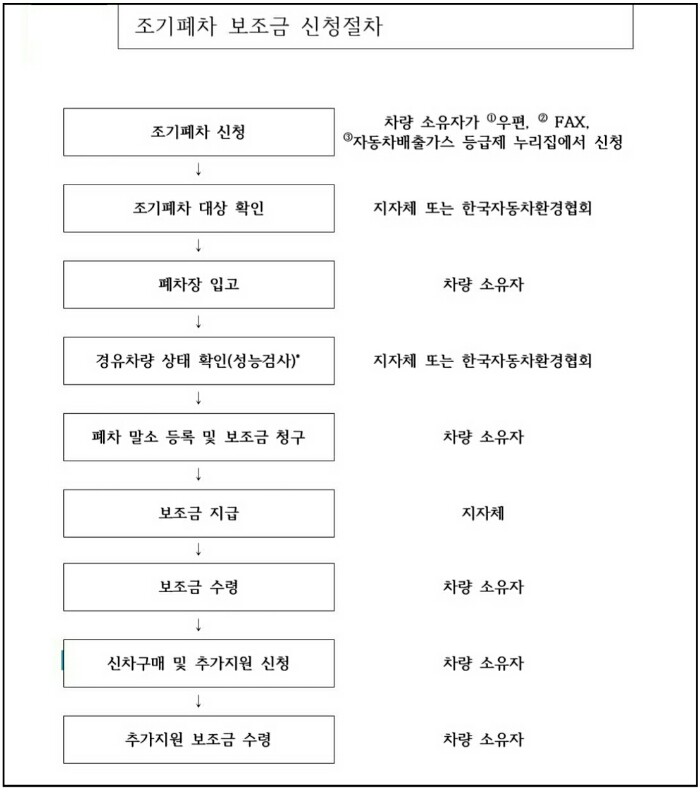 조기폐차 신청 ➡ 조기폐차 대상 확인 ➡ 폐차장 입고 ➡ 노후경유차량 상태 확인(성능검사) ➡ 폐차 말소 등록 및 보조금 신청 ➡ 보조금 지급 ➡ 보조금 수령 ➡ 신차, 중고차 구매 및 추가지원 신청 ➡ 추가지원 보조금 수령