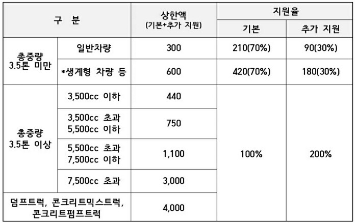 휘발유, 가스 대체차량이 없는 대형 차량은 Euro6 이상 차량을 신규로 구매 시 기준가액의 200%에 해당하는 금액을 추가로 지원합니다.