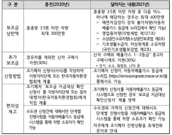 1. 저소득층, 소상공인 소유, 영업용 노후경유차 조기폐차 보조금 상한액을 300만원에서 ➡ 2021년 600만원으로 상향했습니다.