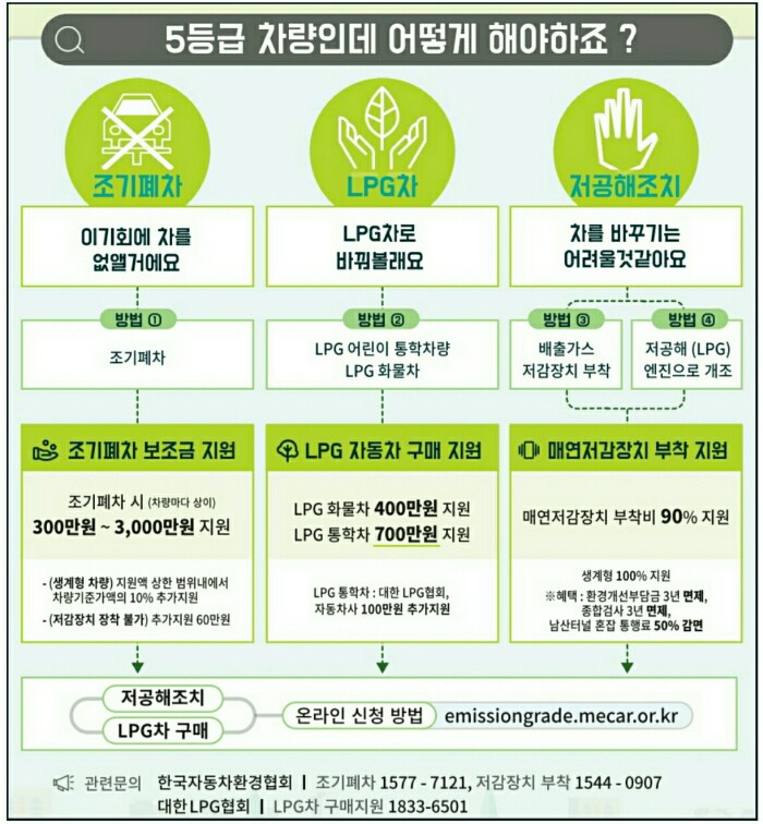 그럼 배출가스 5등급 노후경유차는 조기폐차를 꼭해야 하나요? 저공해 조치 중 하나인 노후경유차 조기폐차는 의무사항이 아닙니다. 매연저감장치(DPF) 부착을 원하시는 경우에는 배출가스 저감 장치 부착 저공해 조치를 하고 보조금을 받으면 됩니다.