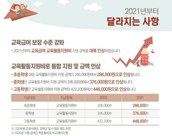 2021년도 교육급여 지원 금액은 2020년 대비 평균 24% 인상함에 따라 교육급여 수급자로 선정되면 초등학생은 연간 28만6000원, 중학생은 37만6000원, 고등학생은 44만8000원의 교육활동지원비를 지원받게 됩니다. 이와 별도로 무상교육 제외 학교에 재학 중인 고등학생은 입학금, 수업료, 교과서비 전액을 추가 지원 받을 수 있다.