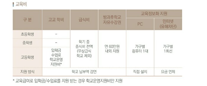 교육비 지원 항목으로는 학교급식비, 방과후학교 자유수강권, 교육 정보화지원 (PC, 인터넷통신비), 고교 학비 (입학금 및 수업료, 학교운영지원비) 등을 지원합니다.
