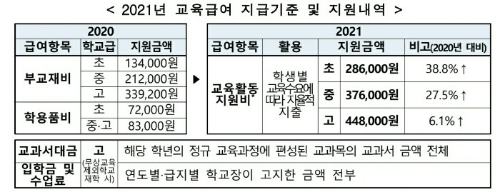 2021년부터 교육급여는 기존의 학용품비, 부교재비 지원에서 학생 개개인이 자율적으로 활용할 수 있도록 학용품비 + 부교재비에서 ➡ 교육활동지원비로 통합해 지원합니다.