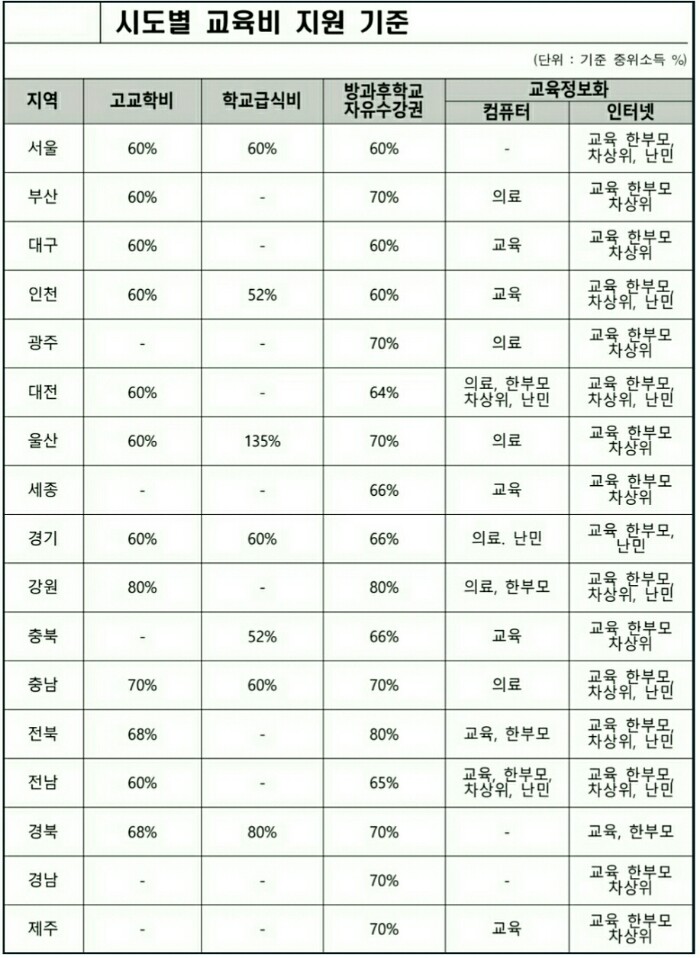 교육비는 지자체 교육청에서 시도별로 예산에 따라 지원하는 교육비 관련 복지제도입니다. 따라서 시도별로 교육비 지원 선정 기준이 통상 중위소득 50%~70%까지 교육비 지원 항목에 달라서 교육급여에 선정되지 않았더라도 교육비는 지원 받을 수 있습니다.