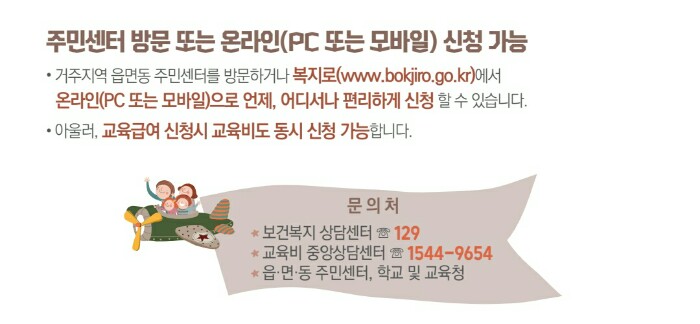 거주지역 읍면동 주민센터를 방문하거나 인터넷 온라인 PC 또는 모바일로 신청하시면 됩니다. 또한 교육급여와 교육비를 동시에 신청할 수 있습니다.