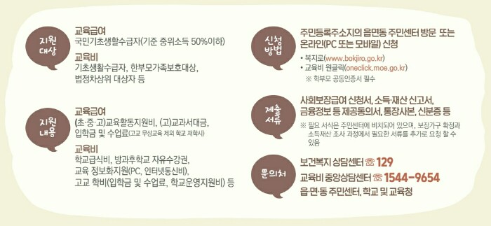 - 초등학교, 중학교, 고등학교, 특수학교 등 학교 또는 시설에 입학 또는 재학하는 생계, 의료, 주거, 교육급여 수급자와 자녀에게 교육급여를 지원합니다.