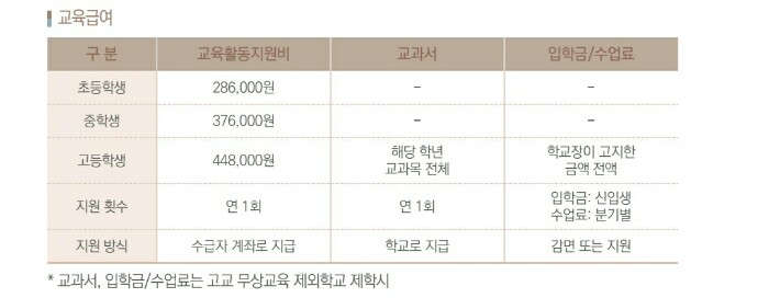 급식비 : 초중고교 학기 중 중식비 전액을 지원합니다. 단, 무상 급식 실시 학년 및 지역은 적용 대상이 아닙니다.