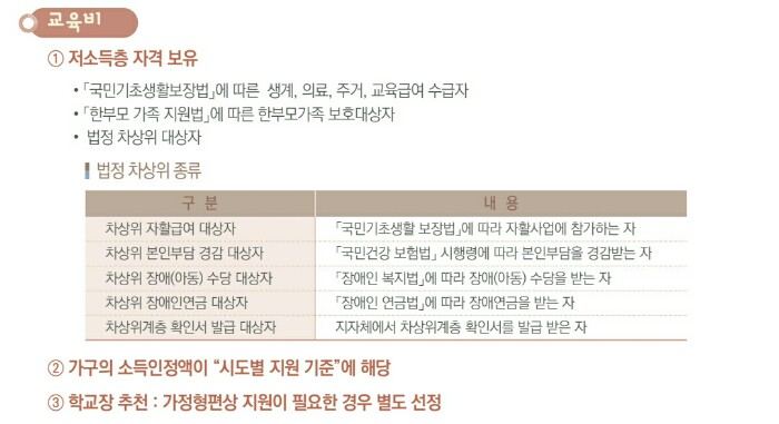 그 중 대표적으로 정부가 지원하는 교육 비용 복지제도에는 ➊ 교육급여 ➊ 초중고 교육비 ➌ 입학준비금 지원 제도가 있습니다. 자격 대상에 해당 된다면 중복으로 지원받을 수 있습니다.