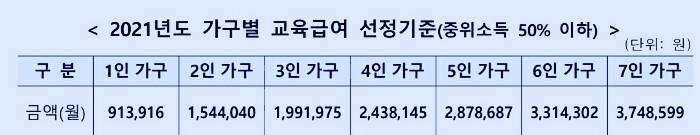 < 2021년 중위소득 50% 이하 교육급여 선정기준 >
