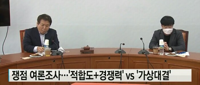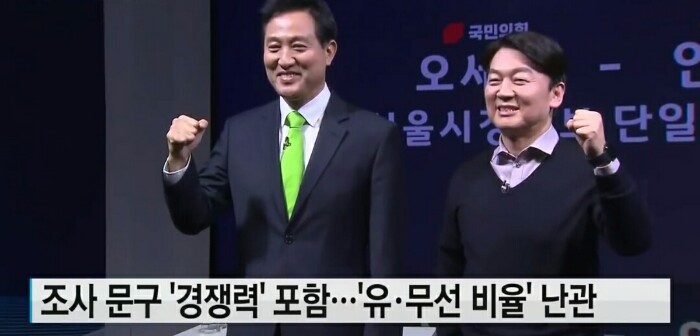 오세훈 후보가 제시한 여론조사 절충안은 1개의 여론기관에는 먼저 경쟁력 묻고 다음 적합도를 묻고 또 다른 1개의 여론기관에는 먼저 적합도를 묻고 다음 경쟁력을 물어서 그걸 합산하는 경쟁력과 적합도를 혼용한 협상안을 수용했습니다.