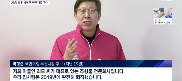 3월 23일 JTBC 보도에 따르면 박형준 후보 아들 회사가 엘시티 아파트에 들어간 28억원어치의 공공미술품 모두에 관여한 걸로 파악됐다고 보도했습니다. 박형준 아들인 최모씨는 조형물 전문회사 대표입니다.
