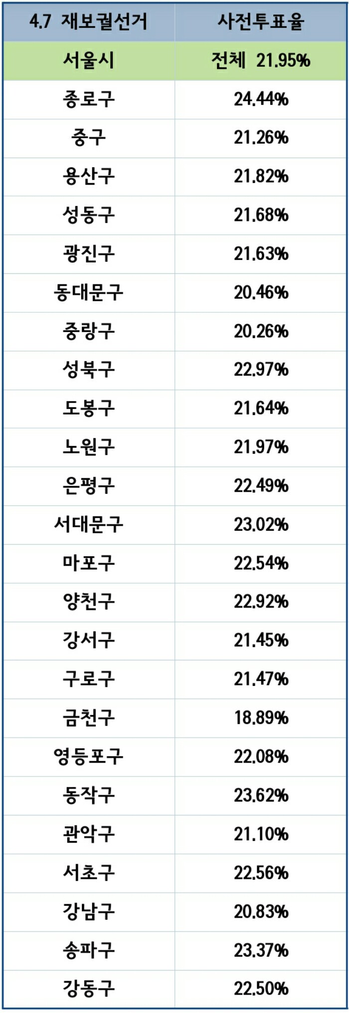 서울시 전체 사전투표율 : 21.95%
