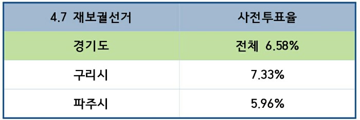 경기도가 가장 낮은 사전투표율을 보였는데 구리시 사전투표율은 7.33%로 91734명 중 6725명, 파주시 사전투표율은 5.96%로 11만2024명 중 6677명이 사전투표했습니다.