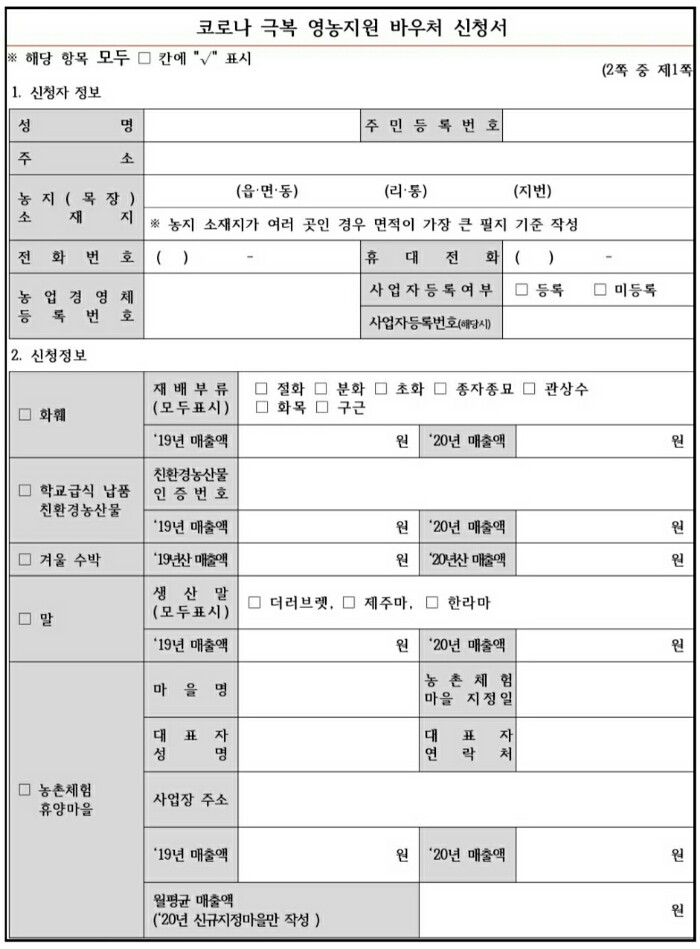 코로나 극복 영농지원 바우처 신청서