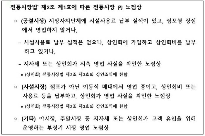 공설시장 노점상 : 지방자치단체에 시설사용료 납부 실적이 있고 점포형 상점에서 영업하지 않거나, 시설사용료 납부 실적은 없으나, 상인회에 가입하고 상인회비를 납부하고 있거나, 지자체 또는 상인회가 지속 영업 사실을 확인한 노점상입니다.