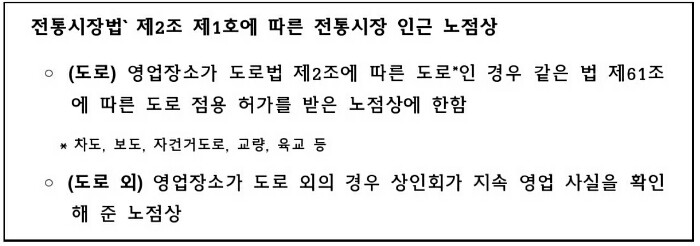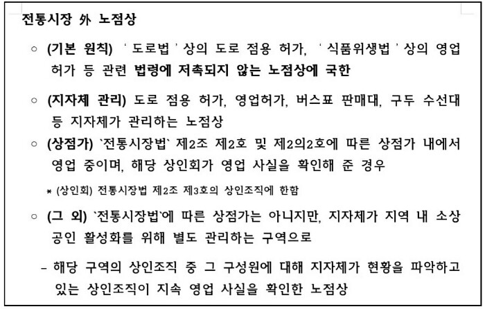 도로법상의 도로 점용 허가, 식품위생법상의 영업허가 등 관련 법령에 저촉되지 않는 노점상에 국한됩니다.