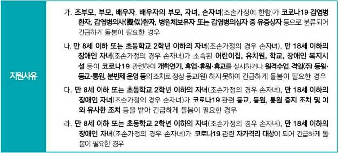 ① 조부모, 부모, 배우자, 배우자의 부모, 자녀, 손자녀가 코로나 감염병환자, 감염병의사환자, 병원체보유자 또는 감염병의심자 중 유증상자 등으로 분류되어 긴급하게 돌봄이 필요한 경우