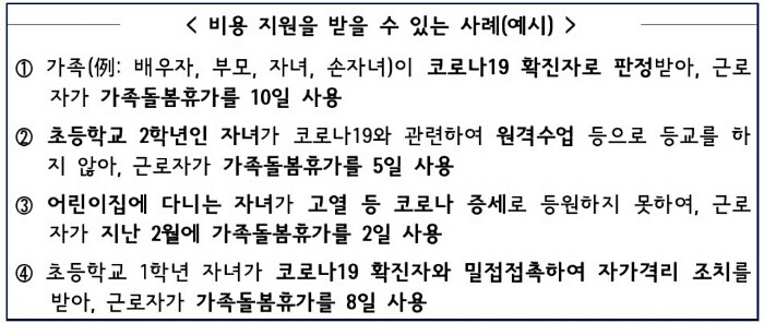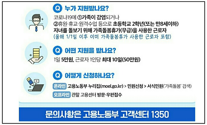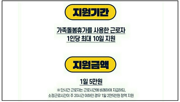 코로나에 가족이 감염되거나 휴원, 휴교, 원격수업 등으로 자녀를 돌보기 위해 2021년 가족돌봄휴가(무급)를 사용한 근로자에게 가족돌봄비용 긴급 지원금을 지급합니다.