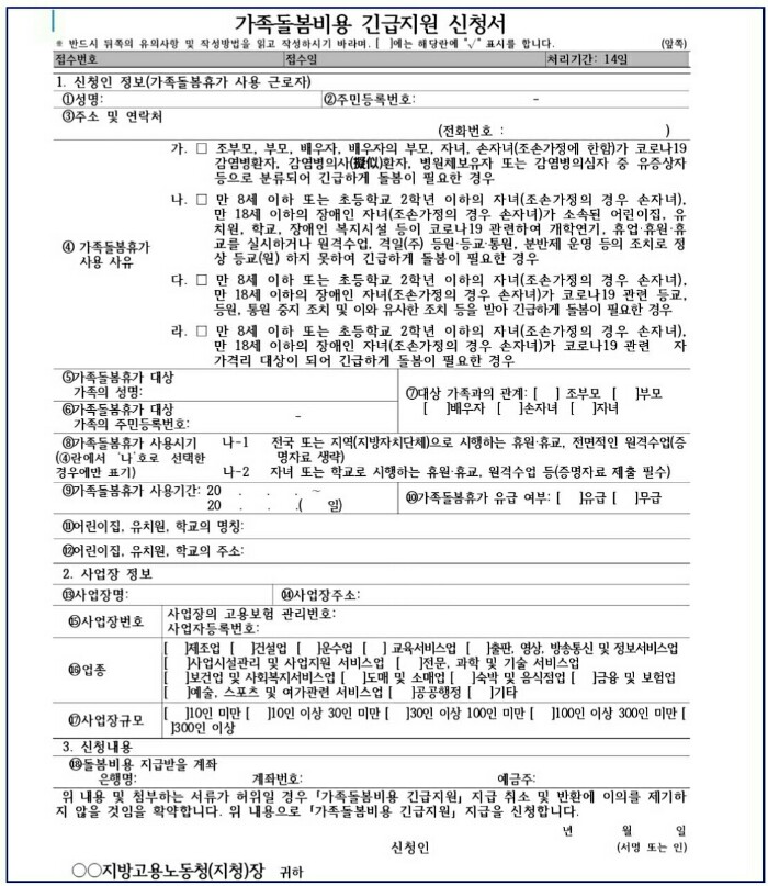가족돌봄휴가 비용 긴급지원 신청서 작성법