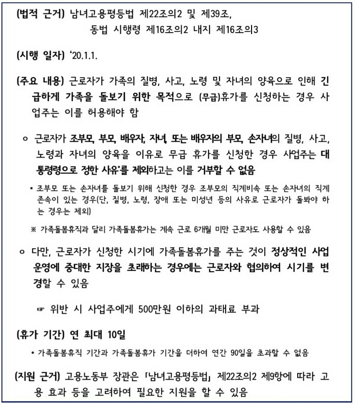 근로자가 가족의 질병, 사고, 노령 및 자녀의 양육으로 인해 긴급하게 가족을 돌보기 위한 목적으로 무급휴가를 신청하는 경우 사업주는 대통령령으로 정한 사유를 제외하고는 이를 거부할 수 없습니다. 위반 시 사업주에게 500만원 이하의 과태료가 부과됩니다.