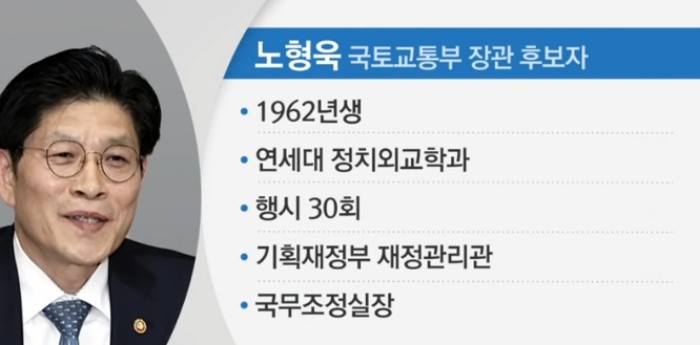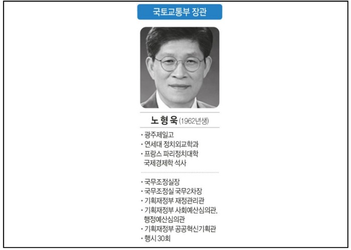 국토부 노형욱 장관은 기획재정부 출신으로 경제기획원에서 공직을 시작한 정통 예산 관료 출신입니다. 기획예산처, 보건복지부, 기획재정부, 국무조정실을 거쳐 국토교통부 장관직을 맡게 됐습니다.