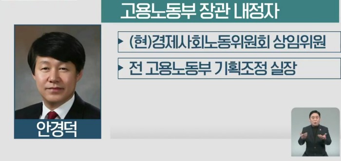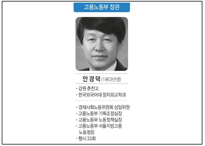 안경덕 후보자는 현재 경제사회노동위원회 상임위원으로 재직 중입니다. 노사관계와 노동 정책에 전문성을 갖춘 관료로 탄력근로제 확대, 최저임금제 개편, 고용위기 대응 등을 주도하여 노동 정책에 대한 이해가 높다는 평가입니다. 고용보험 적용 확대와 청년고용 활성화를 해결하는 하고 노사와의 소통도 강화해 나갈 것으로 기대됩니다.